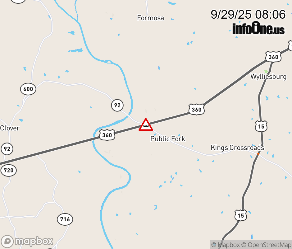 On US-360 in the County of Charlotte, in the vicinity of Jeb Stuart Hwy; VA-92N/S, motorists can expect delays due to a multi-vehicle crash. All east lanes are closed. The west left shoulder and left lane are closed. Updated: Mon 9/29/25 8:06 AM EDT ![]() Updated: Mon 9/29/25 8:06 AM EDT |
