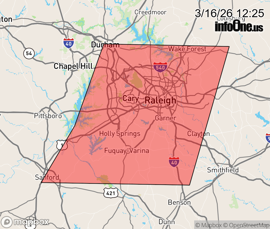 Canceled 3/16/26 1:30 PM Special Weather Statement issued March 16 at 12:24PM EDT by NWS Raleigh NC At 1224 PM EDT, Doppler radar was tracking strong thunderstorms along a line extending from near Cary to 12 miles northwest of Fuquay-Varina to near Sanford. Movement was east at 25 mph. HAZARD...Wind gusts of 50 to 55 mph. SOURCE...Radar indicated. IMPACT...Gusty winds could knock down tree limbs and blow around unsecured objects. Locations impacted include... Raleigh, Durham, Cary, Sanford, Wake Forest, Garner, Fuquay-Varina, Clayton, Angier, and RDU International. This includes the following highways... Interstate 40 between Mile Markers 275 and 323. Interstate 440 between Mile Markers 1 and 16. Interstate 540 between Mile Markers 0 and 24. US 1 between Mile Markers 80 and 101. the Durham Freeway between Mile Markers 2 and 11. ![]() |