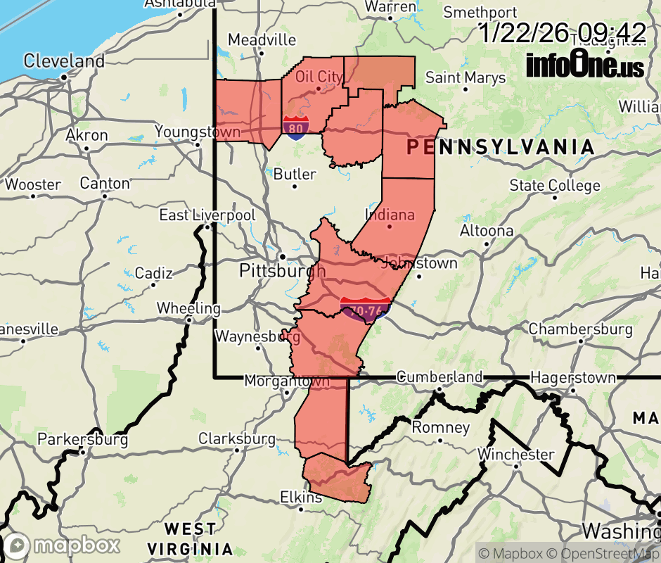Canceled 1/22/26 10:00 AM Winter Weather Advisory issued January 22 at 9:41AM EST until January 22 at 10:00AM EST by NWS Pittsburgh PA * WHAT... Moderate to major impacts to the region are possible later this weekend with periods of moderate to heavy snow. Accumulations of greater than 6 inches are possible. * WHERE... Portions of northwest, southwest, and western Pennsylvania and northern West Virginia. * WHEN... From Saturday evening through Monday afternoon. * IMPACTS... Travel could be very difficult to impossible. The hazardous conditions could impact the Thursday morning and evening commutes. ![]() |