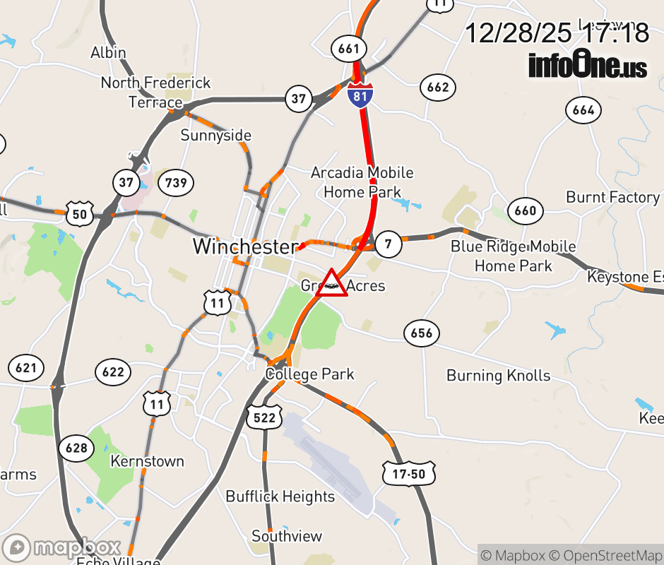 On I-81 South at mile marker 314.9 in the County of Frederick, motorists can expect delays due to a multi-vehicle crash. Traffic backups are approximately 2.5 miles. Updated: Sun 12/28/25 5:18 PM EST ![]() Updated: Sun 12/28/25 5:18 PM EST |