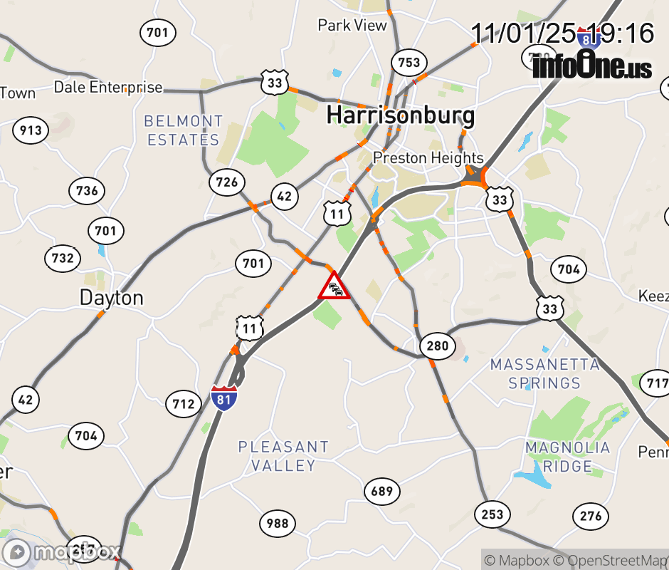 On I-81 at mile marker 245 in the County of Rockingham, motorists can expect delays due to a brush fire. The north right lane and right shoulder are closed. Updated: Sat 11/1/25 7:16 PM EDT ![]() |