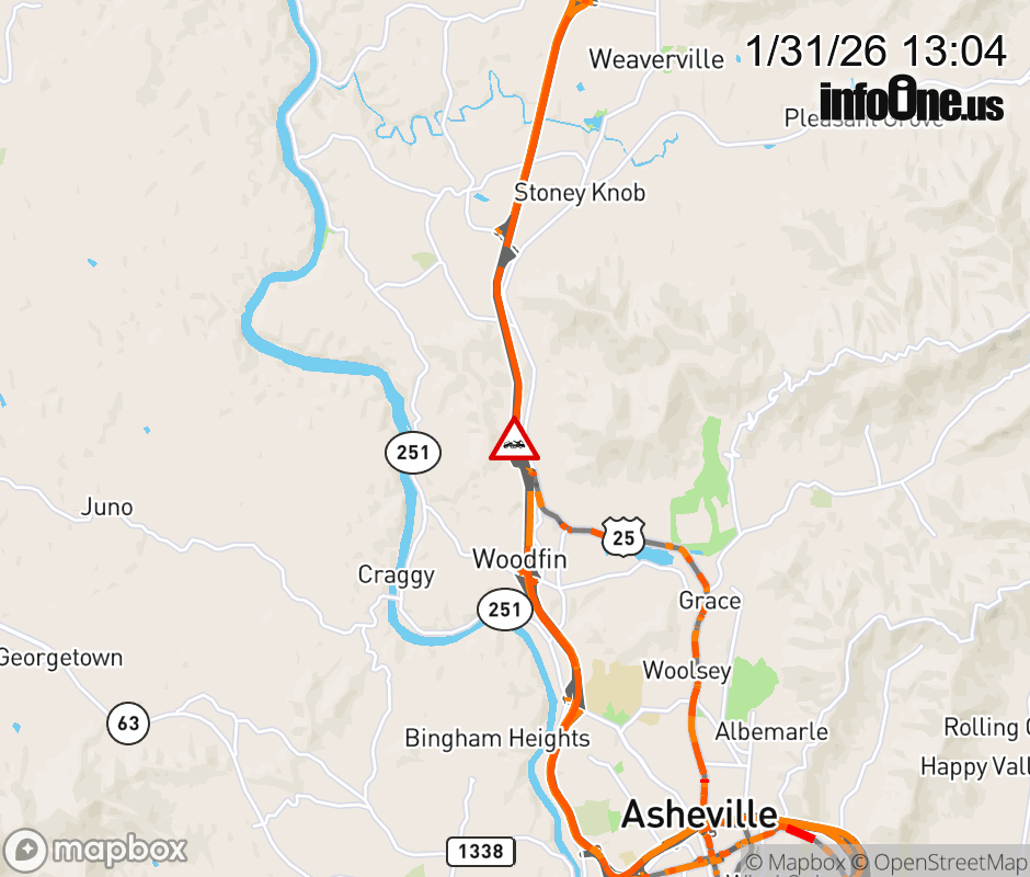 The right lane is closed after Exit 23, US 25 (Merrimon Avenue). Updated: Sat 1/31/26 1:04 PM EST ![]() Updated: Sat 1/31/26 1:04 PM EST |