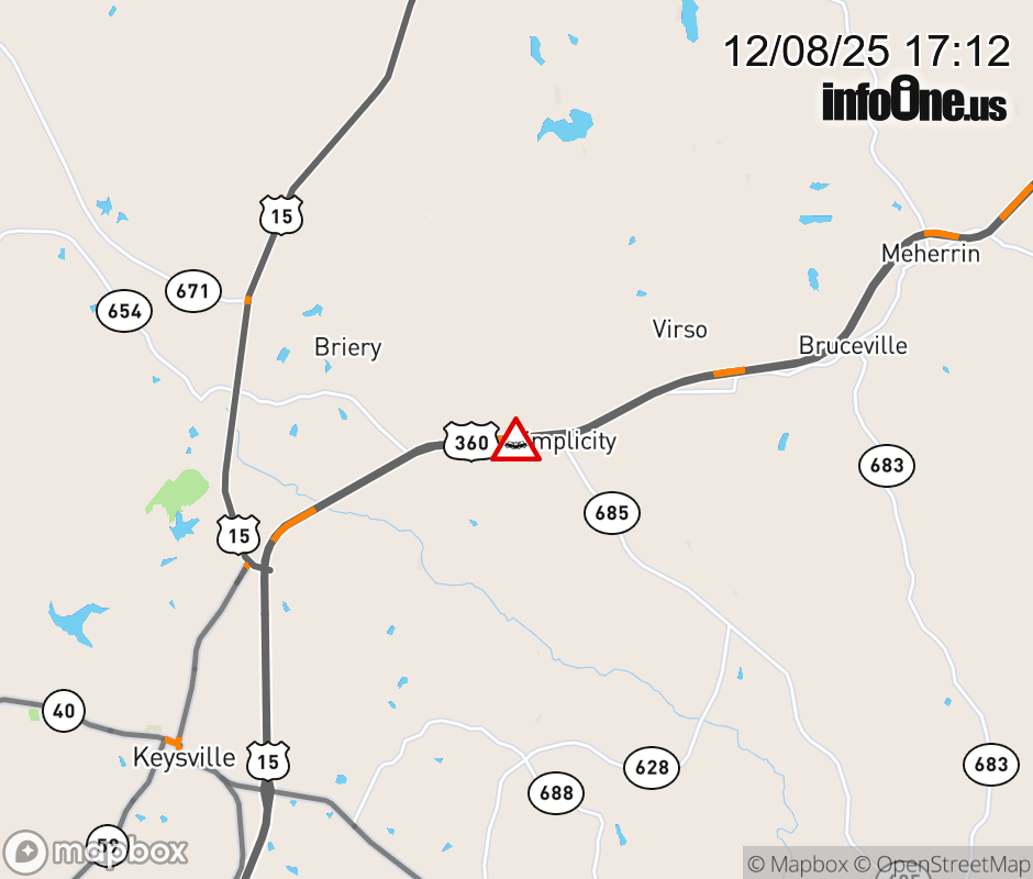 On US-360 in the County of Prince Edward, in the vicinity of Germantown Rd; Patrick Henry Hwy; Rt. 685N/S (Lunenburg County), motorists can expect delays due to a tractor trailer crash. All east lanes are closed. ![]() |