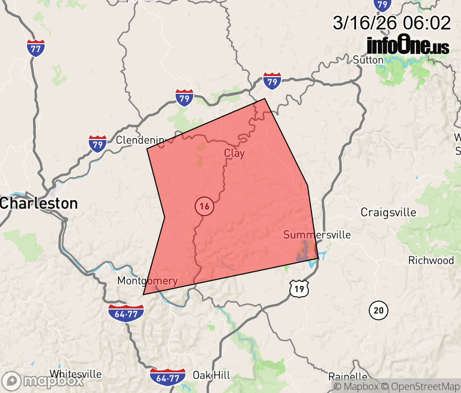 Canceled 3/16/26 6:18 AM Severe Thunderstorm Warning issued March 16 at 6:00AM EDT until March 16 at 6:30AM EDT by NWS Charleston WV At 600 AM EDT, a severe thunderstorm was located near Glen, or 12 miles southwest of Clay, moving northeast at 50 mph. HAZARD...60 mph wind gusts. SOURCE...Radar indicated. IMPACT...Expect damage to roofs, siding, and trees. Locations impacted include... Summersville, Clay, Montgomery, Smithers, Gauley Bridge, Glen, Powellton, Bickmore, Procious, Swiss, Indore, Bentree, Kesslers Cross Lanes, Drennan, Ivydale, and Pond Gap. ![]() |