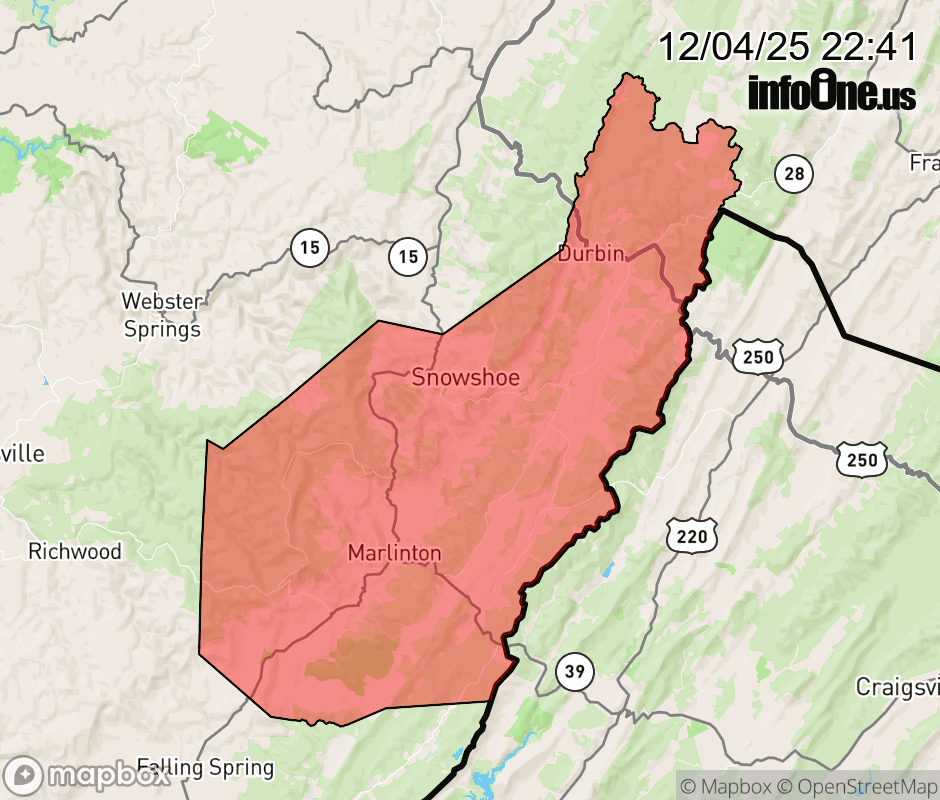 Canceled 12/5/25 4:26 AM Winter Weather Advisory issued December 4 at 10:39PM EST until December 5 at 10:00AM EST by NWS Charleston WV * WHAT... Snow. Additional snow accumulations between 3 and 5 inches. * WHERE... Northwest Pocahontas and Southeast Pocahontas Counties. * WHEN... Until 10 AM EST Friday. * IMPACTS... Plan on slippery road conditions. The hazardous conditions could impact the Friday morning commute. ![]() |