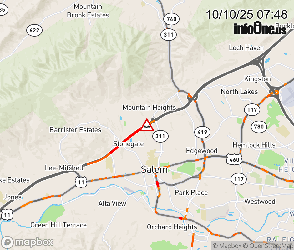 On I-81 at mile marker 140 in the County of Roanoke, motorists can expect delays due to a vehicle crash. The north left shoulder is closed. Updated: Fri 10/10/25 7:48 AM EDT ![]() Updated: Fri 10/10/25 7:48 AM EDT |