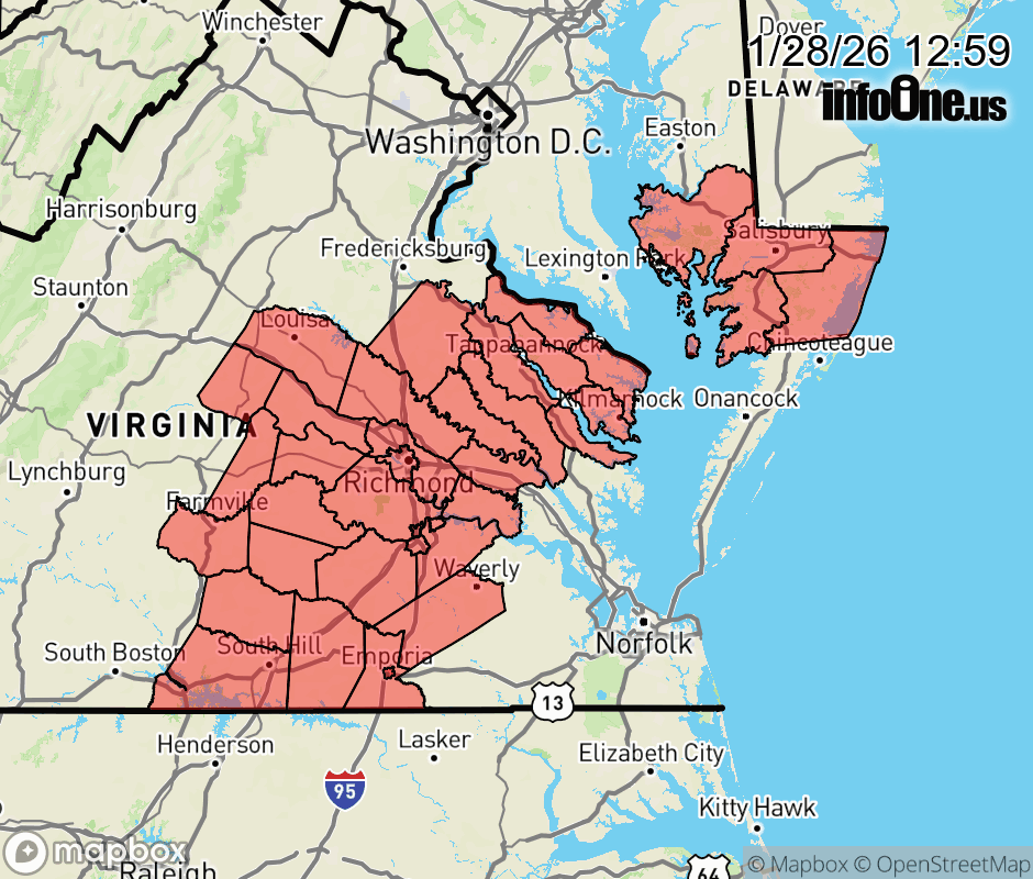 Canceled 1/28/26 8:00 PM Cold Weather Advisory issued January 28 at 12:57PM EST until January 29 at 10:00AM EST by NWS Wakefield VA * WHAT... Very cold wind chills as low as 2 below expected. * WHERE... Portions of southeast Maryland and central, east central, eastern, north central, south central, and southeast Virginia. * WHEN... From 7 PM this evening to 10 AM EST Thursday. * IMPACTS... The cold wind chills could result in hypothermia if precautions are not taken. * ADDITIONAL DETAILS... In addition to the cold, patchy areas of black ice will likely develop on area roadways. Use caution while traveling, especially on untreated secondary roads, bridges, and overpasses. ![]() |