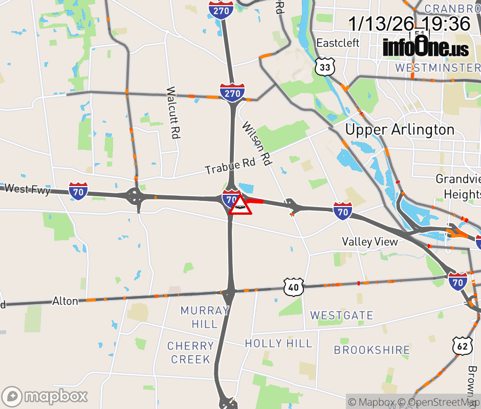 The 2 left lanes are blocked on Ramp I-270 North to I-70 East (Westside), due to a crash. Updated: Tue 1/13/26 7:36 PM EST ![]() Updated: Tue 1/13/26 7:36 PM EST |