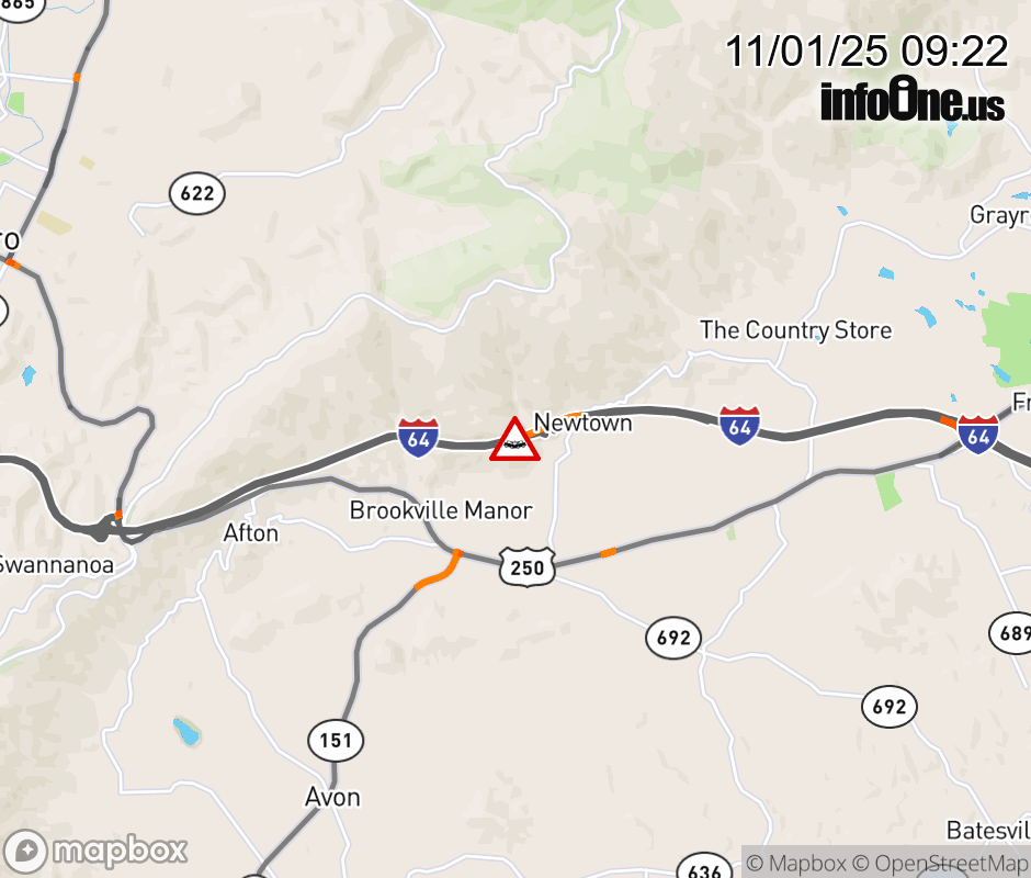 On I-64 West at mile marker 103.3 in the County of Albemarle, motorists can expect delays due to a vehicle crash. Updated: Sat 11/1/25 9:22 AM EDT ![]() Updated: Sat 11/1/25 9:22 AM EDT |