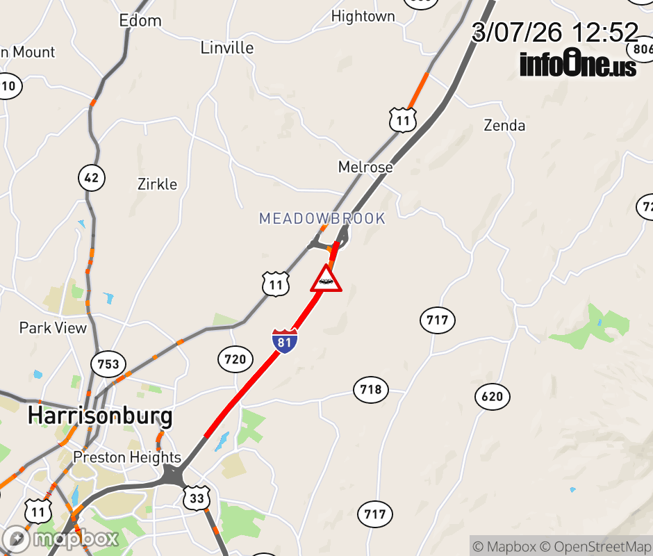 On I-81 South at mile marker 250.8 in the County of Rockingham, motorists can expect delays due to a vehicle crash. Traffic backups are approximately 3.0 miles. Updated: Sat 3/7/26 12:52 PM EST ![]() Updated: Sat 3/7/26 12:52 PM EST |