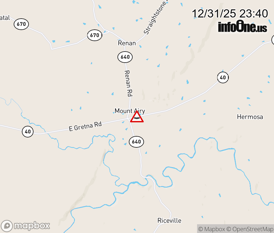 On VA-40 in the County of Pittsylvania, in the vicinity of Renan Rd; Riceville Rd; Rt. 640N/S (Pittsylvania County), motorists can expect delays due to a vehicle crash. All east lanes are closed. Updated: Wed 12/31/25 11:40 PM EST ![]() Updated: Wed 12/31/25 11:40 PM EST |