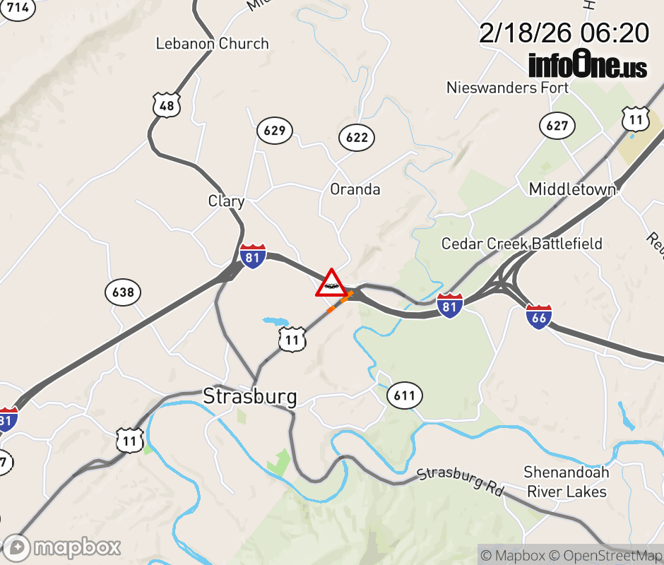 On I-81 at mile marker 298 in the County of Shenandoah, motorists can expect delays due to a tractor trailer crash. The south right shoulder is closed. ![]() |