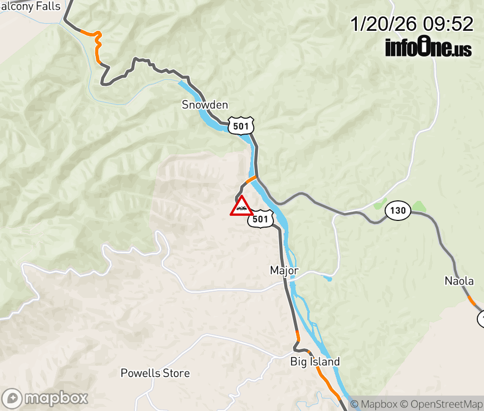 On US-501 in the County of Bedford, in the vicinity of Peters Creek Rd; Rt. 600N/S (Bedford County), motorists can expect delays due to a disabled tractor trailer. All north lanes are closed. All south lanes are closed. ![]() |