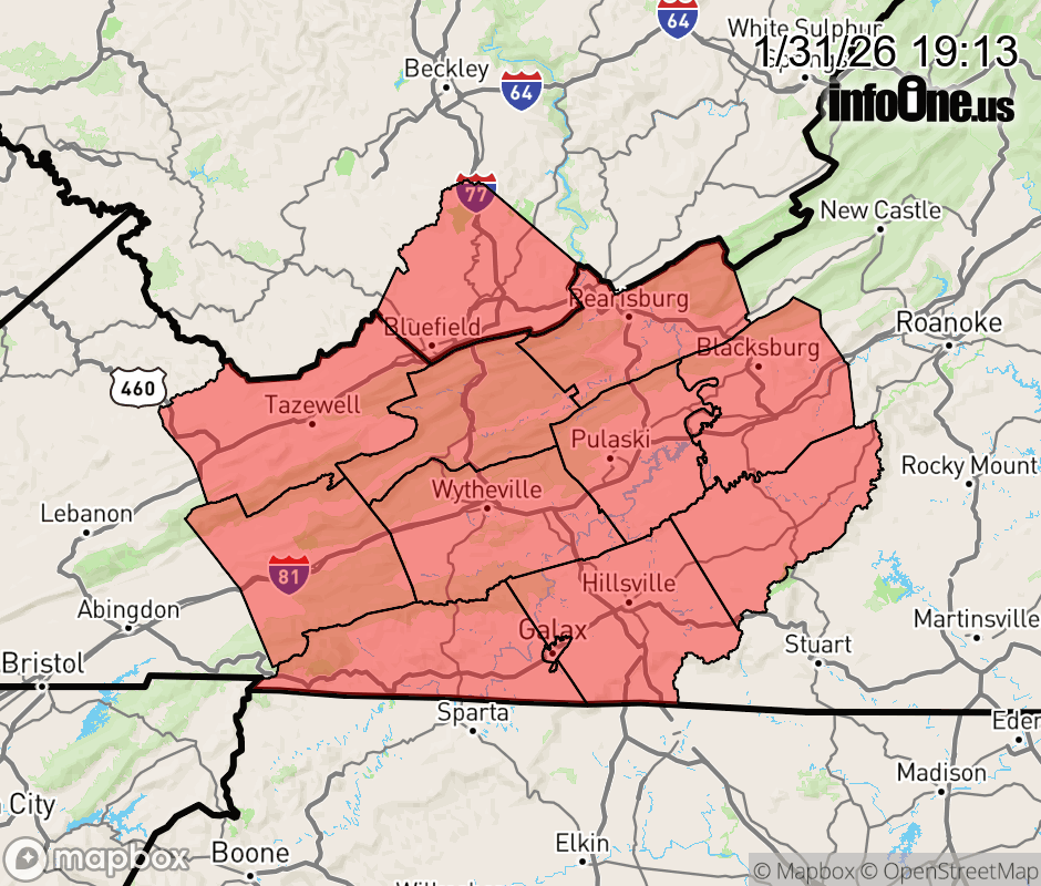 Canceled 2/1/26 1:51 AM Winter Storm Warning issued January 31 at 7:12PM EST until February 1 at 1:00PM EST by NWS Blacksburg VA * WHAT... Moderate to heavy snow. Additional snow accumulations up to one to two inches. Winds gusting as high as 50 mph. * WHERE... Portions of southwest Virginia and southeast West Virginia. * WHEN... Until 1 PM EST Sunday. * IMPACTS... Plan on slippery road conditions. Gusty winds could bring down tree branches. * ADDITIONAL DETAILS... Strong winds Saturday night into Sunday will result in blowing and drifting snow...reducing visibility at times. ![]() |