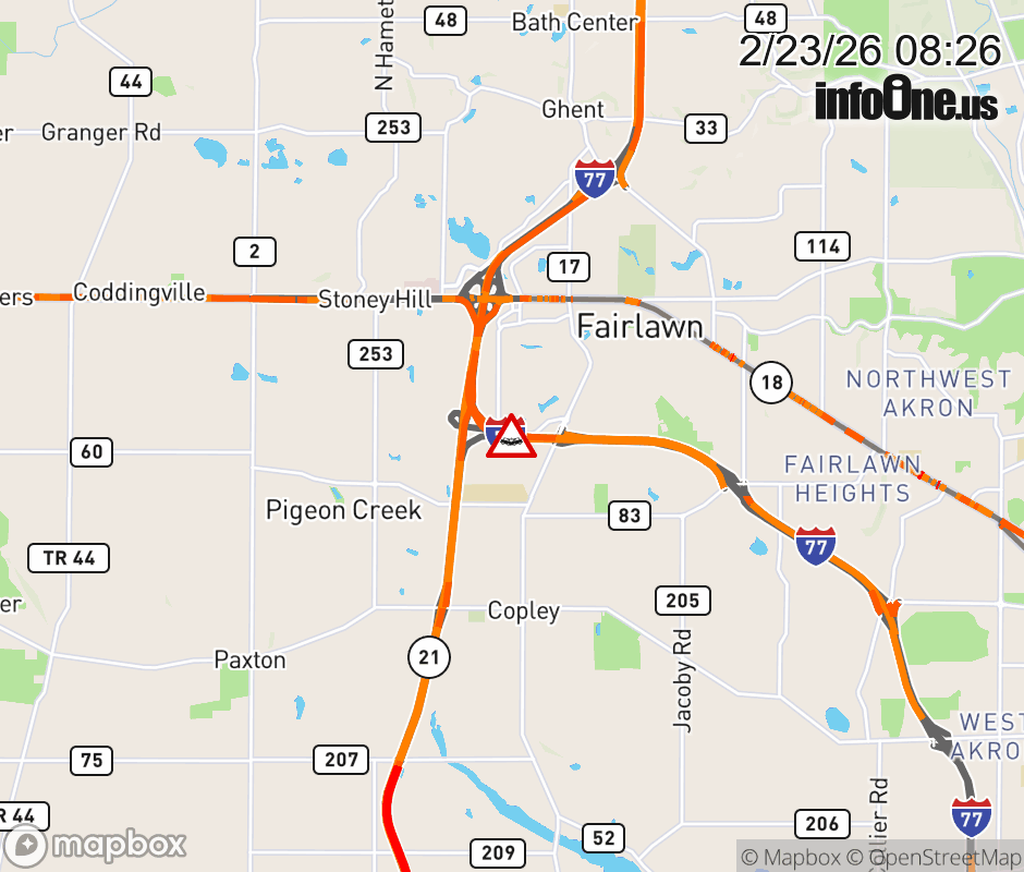 The left lane is blocked on I-77 North at SR-21 South, due to a crash. Updated: Mon 2/23/26 8:26 AM EST ![]() Updated: Mon 2/23/26 8:26 AM EST |