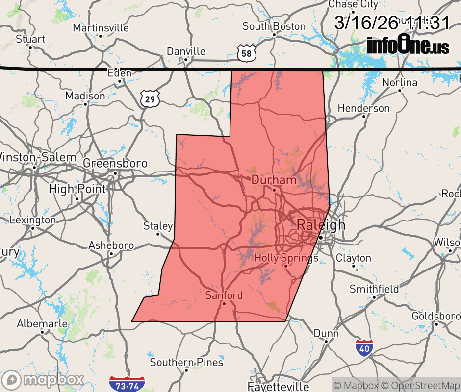 Canceled 3/16/26 12:30 PM Special Weather Statement issued March 16 at 11:29AM EDT by NWS Raleigh NC At 1129 AM EDT, Doppler radar was tracking strong thunderstorms along a line extending from near Baynes to 7 miles northwest of Pittsboro to 7 miles northwest of Carthage. Movement was northeast at 55 mph. HAZARD...Wind gusts of 50 to 55 mph. SOURCE...Radar indicated. IMPACT...Gusty winds could knock down tree limbs and blow around unsecured objects. Locations impacted include... Raleigh, Durham, Cary, Chapel Hill, Burlington, Sanford, Graham, Roxboro, Hillsborough, and Creedmoor. This includes the following highways... Interstate 85 between Mile Markers 163 and 201. Interstate 40 between Mile Markers 144 and 162, and between Mile Markers 259 and 296. Interstate 440 between Mile Markers 1 and 8. Interstate 540 between Mile Markers 0 and 14. US 1 between Mile Markers 69 and 101. the Durham Freeway between Mile Markers 2 and 17. ![]() |