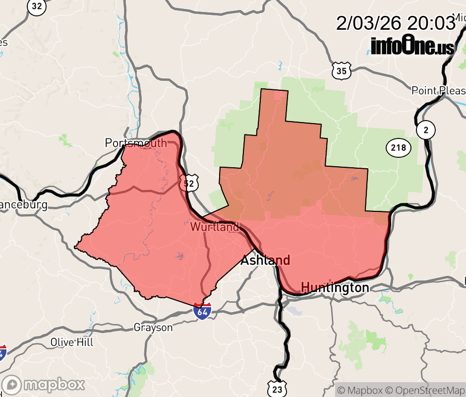 Canceled 2/3/26 8:06 PM Winter Weather Advisory issued February 3 at 8:01PM EST until February 3 at 10:00PM EST by NWS Charleston WV * WHAT... Wet snow. Additional snow accumulations up to one inch. * WHERE... In Kentucky, Greenup County. In Ohio, Lawrence OH County. * WHEN... Until 10 PM EST this evening. * IMPACTS... Plan on slippery road conditions. ![]() |
