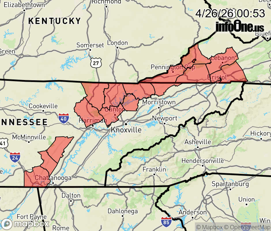 Dense Fog Advisory issued April 26 at 12:52AM EDT until April 26 at 9:00AM EDT by NWS Morristown TN * WHAT... Visibility one quarter to one half mile in dense fog. * WHERE... Portions of East Tennessee and southwest Virginia. * WHEN... Until 9 AM EDT /8 AM CDT/ this morning. * IMPACTS... Low visibility could make driving conditions hazardous. ![]() |