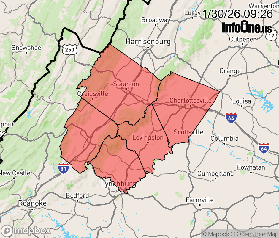 Canceled 1/30/26 10:49 AM Cold Weather Advisory issued January 30 at 9:25AM EST until January 30 at 11:00AM EST by NWS Baltimore MD/Washington DC * WHAT... For the first Cold Weather Advisory, very cold wind chills as low as 10 below. For the second Cold Weather Advisory, very cold wind chills as low as 10 below expected. * WHERE... Central Virginia Blue Ridge. * WHEN... For the first Cold Weather Advisory, until 11 AM EST this morning. For the second Cold Weather Advisory, from 7 PM this evening to 11 AM EST Saturday. * IMPACTS... Frostbite and hypothermia will occur if unprotected skin is exposed to these temperatures. The cold wind chills as low as 10 below zero could result in hypothermia if precautions are not taken. Wind chill values can lead to hypothermia with prolonged exposure. ![]() |