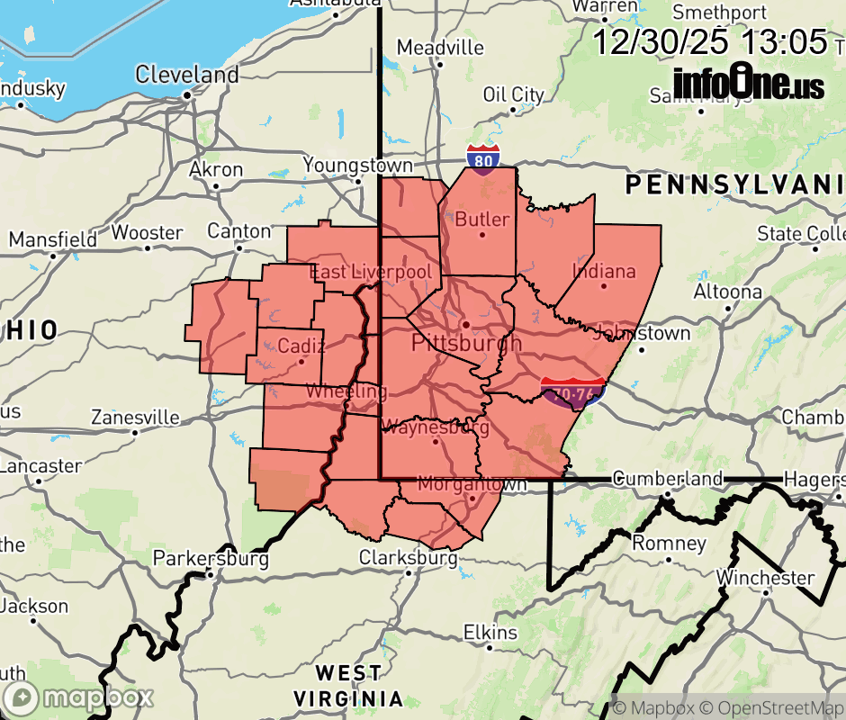 Canceled 12/30/25 9:01 PM Winter Weather Advisory issued December 30 at 1:04PM EST until January 1 at 10:00AM EST by NWS Pittsburgh PA * WHAT... Snow expected. Total snow accumulations between 3 and 5 inches. Snow squall conditions will be possible during the evening and overnight. * WHERE... Portions of east central Ohio, southwest and western Pennsylvania, and northern and the northern panhandle of West Virginia. * WHEN... From 1 PM Wednesday to 10 AM EST Thursday. * IMPACTS... Plan on slippery road conditions. The hazardous conditions will impact the Wednesday evening and Thursday morning commutes. ![]() |