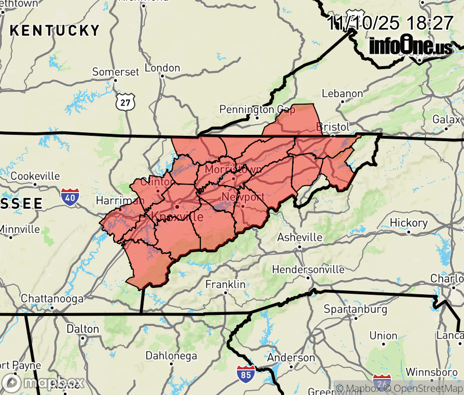 Canceled 11/10/25 9:00 PM Winter Weather Advisory issued November 10 at 6:25PM EST until November 10 at 9:00PM EST by NWS Morristown TN * WHAT... Scattered snow showers. Most areas will receive little or no additional accumulation, but some more persistent or heavy snow showers may bring a quick inch or less early this evening. some narrow bands of 1 to 2 inches could occur. * WHERE... Portions of east Tennessee and southwest Virginia. * WHEN... Until 9 PM EST this evening. * IMPACTS... Plan on slippery road conditions this evening and reduced visibility in any heavier snow showers. ![]() |
