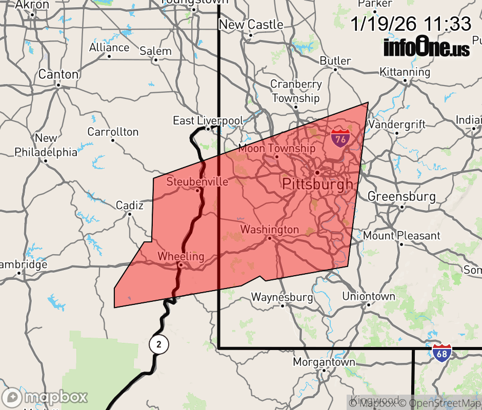 Canceled 1/19/26 11:58 AM Snow Squall Warning issued January 19 at 11:31AM EST until January 19 at 12:00PM EST by NWS Pittsburgh PA At 1131 AM EST, a dangerous snow squall was located along a line from over Homestead to near Bethlehem, or along a line from near Pittsburgh to near Bethlehem, moving east at 25 mph. HAZARD...Intense bursts of heavy snow and gusty winds leading to blowing snow and rapidly falling visibility. Wind gusts greater than 35 mph. SOURCE...Doppler radar and webcams. IMPACT...Travel will become difficult and potentially dangerous within minutes. Locations impacted include... Pittsburgh, Penn Hills, Mount Lebanon, Bethel Park, Ross Township, Wheeling, McCandless Township, Monroeville, Moon Township, McMurray, Weirton, McKeesport, Steubenville, Washington, Franklin Park, Aliquippa, Moundsville, Canonsburg, Martins Ferry and St. Clairsville. ![]() |