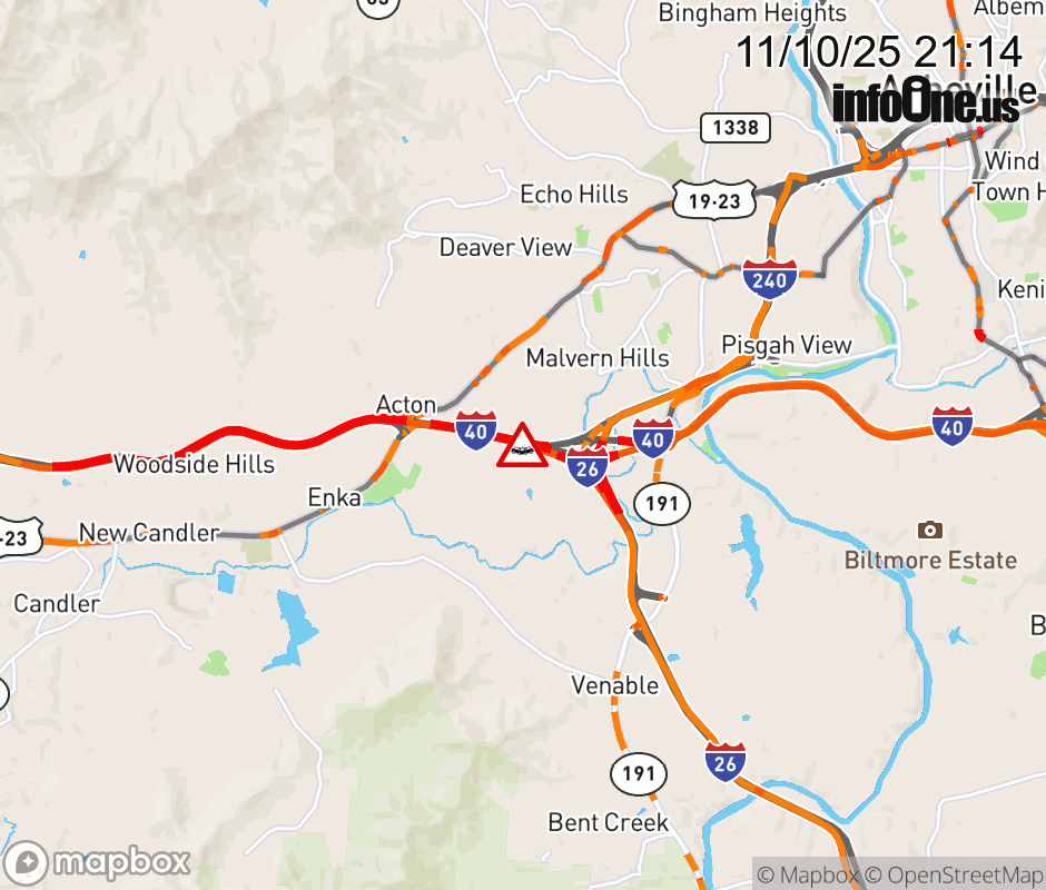 The right lane is closed 1 mile east of Exit 44, US 19/23/74 ALT (Smokey Park Highway). Updated: Mon 11/10/25 9:14 PM EST ![]() Updated: Mon 11/10/25 9:14 PM EST |