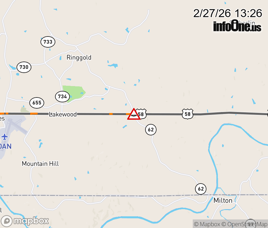 On US-58 West in the County of Pittsylvania, in the vicinity of Ringgold Depot Rd; Rt. 726N/S (Pittsylvania County), motorists can expect delays due to a vehicle crash. Lane closures exist. Updated: Fri 2/27/26 1:26 PM EST ![]() Updated: Fri 2/27/26 1:26 PM EST |