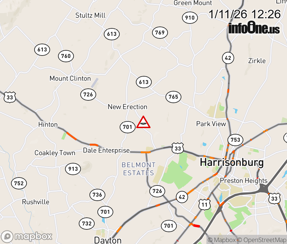 On Rt. 726 in the County of Rockingham, in the vicinity of Eversole Rd; Rt. 766E/W (Rockingham County), motorists can expect delays due to a vehicle crash. All east lanes are closed. All west lanes are closed. ![]() |