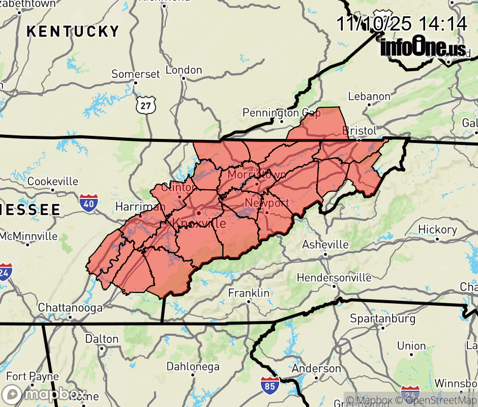 Canceled 11/10/25 6:27 PM Winter Weather Advisory issued November 10 at 2:12PM EST until November 10 at 7:00PM EST by NWS Morristown TN * WHAT... Widespread snow showers are expected this afternoon, with periods of reduced visibility in snow squalls. Most areas will receive less than an inch, but some narrow bands of 1 to 2 inches could occur. * WHERE... Portions of east Tennessee and southwest Virginia. * WHEN... Until 7 PM EST this evening. * IMPACTS... Plan on slippery road conditions. The hazardous conditions could impact the Monday evening commute. ![]() |
