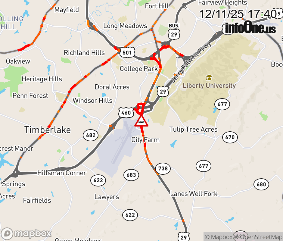 On US-29 in the County of Campbell, in the vicinity of Mountain Lake Rd, motorists can expect delays due to a vehicle crash. The south left shoulder and left lane are closed. ![]() |