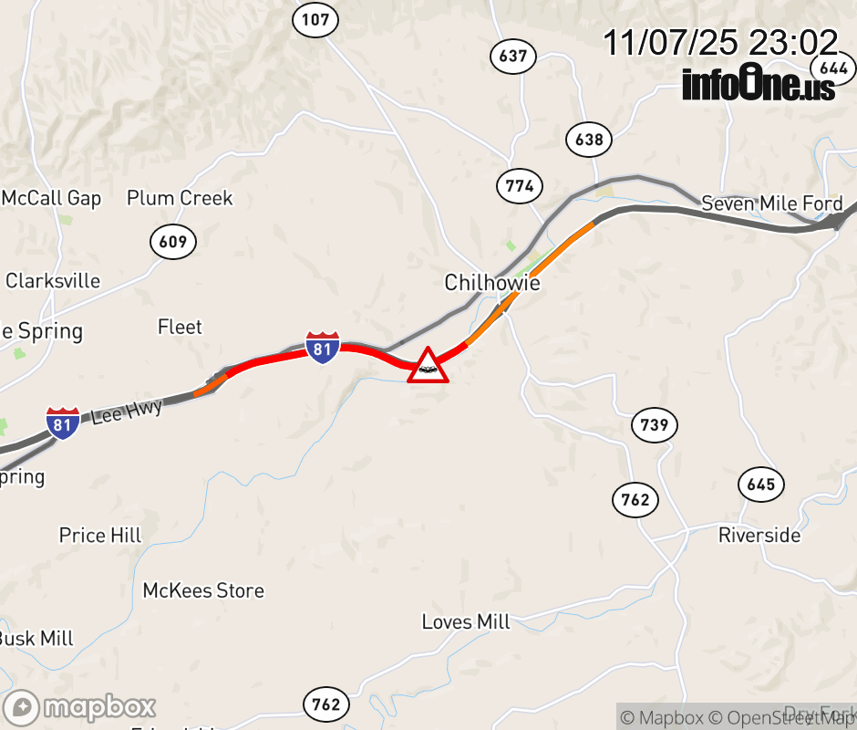 On I-81 North at mile marker 34.4 in the County of Smyth, motorists can expect delays due to a tractor trailer crash. Traffic backups are approximately 1.0 mile. Updated: Fri 11/7/25 11:02 PM EST ![]() Updated: Fri 11/7/25 11:02 PM EST |
