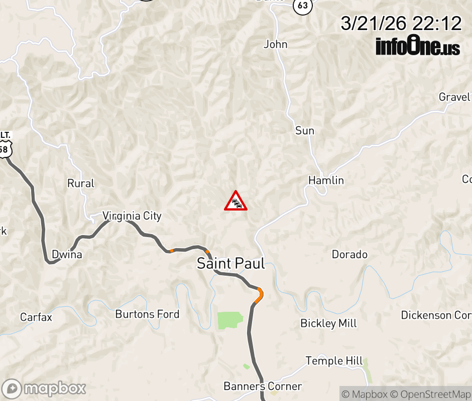 On Rt. 628 in the County of Wise, in the vicinity of Sycamore Ln; County/City/Town Line: RUSSELL CO LINE & CASTLEWOOD, motorists can expect delays due to weather. All north lanes are closed. All south lanes are closed. Updated: Sat 3/21/26 10:12 PM EDT ![]() Updated: Sat 3/21/26 10:12 PM EDT |