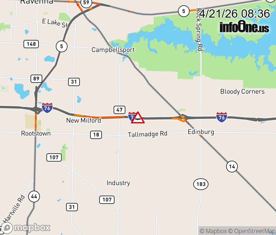 Expect lane closures on I-76 West beyond SR-14/Alliance/Ravenna, due to a crash. ![]() |