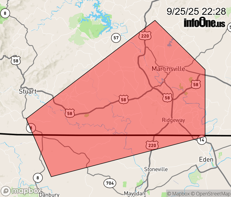 Canceled 9/25/25 10:50 PM Severe Thunderstorm Warning issued September 25 at 10:27PM EDT until September 25 at 11:30PM EDT by NWS Blacksburg VA SVRRNK The National Weather Service in BLACKSBURG has issued a * Severe Thunderstorm Warning for... Northeastern Stokes County in north central North Carolina... Northwestern Rockingham County in north central North Carolina... The City of Martinsville in south central Virginia... Western Henry County in south central Virginia... Southeastern Patrick County in southwestern Virginia... * Until 1130 PM EDT. * At 1027 PM EDT, a severe thunderstorm was located near Sandy Ridge, moving northeast at 20 mph. HAZARD...60 mph wind gusts and quarter size hail. SOURCE...Radar indicated. IMPACT...Hail damage to vehicles is expected. Expect wind damage to roofs, siding, and trees. * Locations impacted include... Martinsville... Spencer... Sandy Ridge... Bassett... Ridgeway... Critz... and Villa Heights. ![]() |