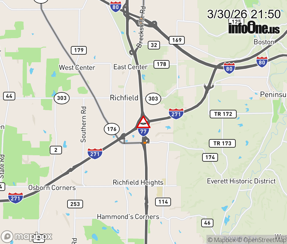 The left lane is blocked on I-77 North beyond I-271 North, due to a crash. Updated: Mon 3/30/26 9:50 PM EDT ![]() Updated: Mon 3/30/26 9:50 PM EDT |