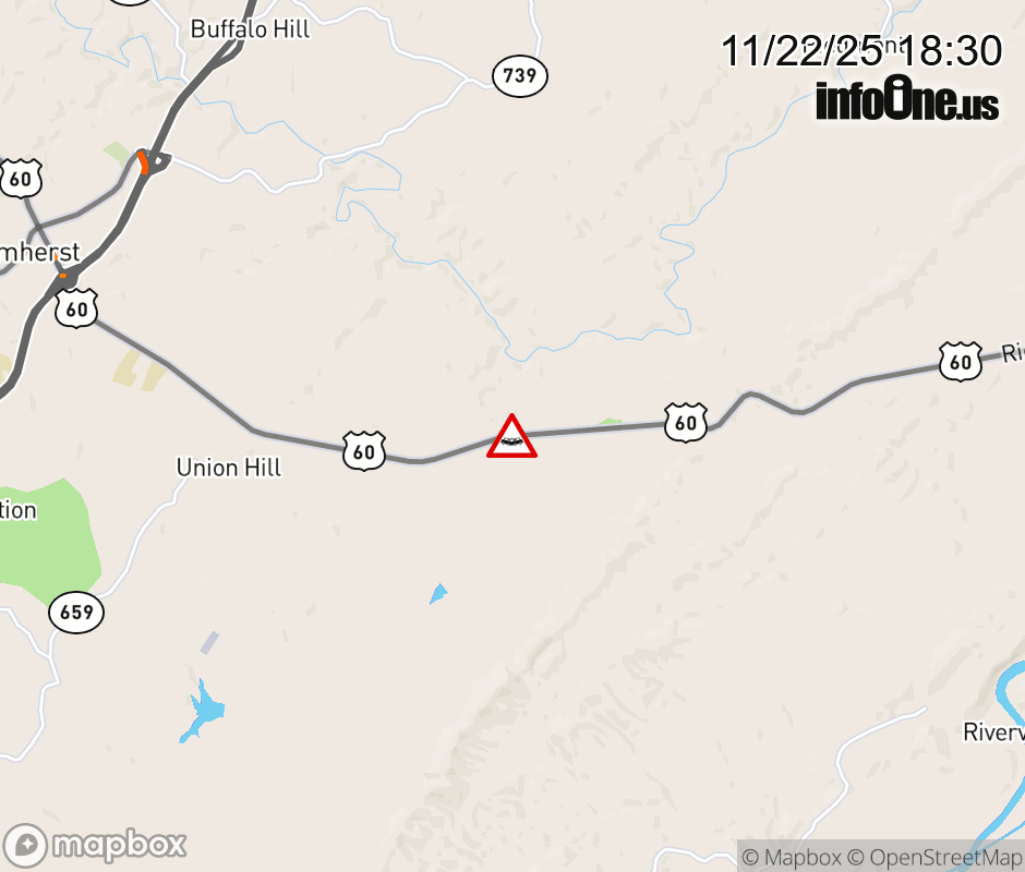 On US-60 in the County of Amherst, in the vicinity of Riverville Rd; Rt. 600E/W (Amherst County), motorists can expect delays due to a vehicle crash. All east lanes are closed. ![]() |