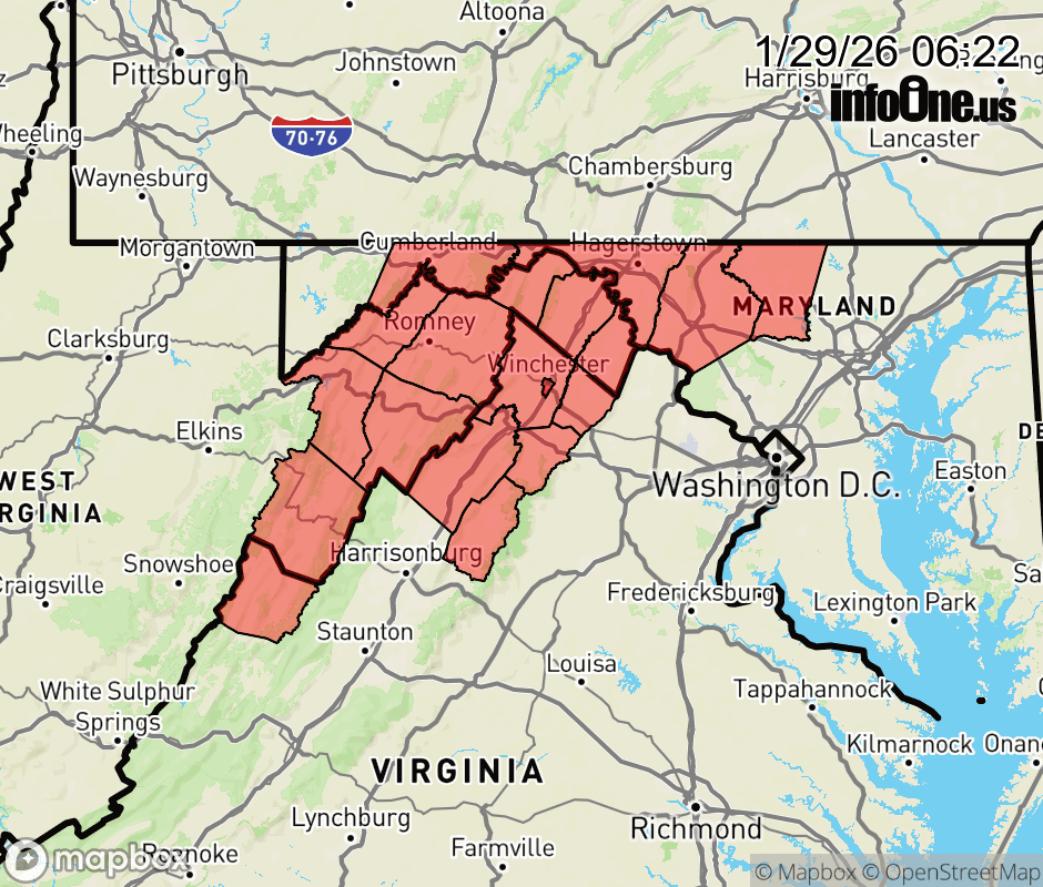 Canceled 1/29/26 10:58 AM Cold Weather Advisory issued January 29 at 6:20AM EST until January 29 at 11:00AM EST by NWS Baltimore MD/Washington DC * WHAT... Very cold wind chills as low as 15 below zero. * WHERE... Portions of north central and western Maryland, northwest and western Virginia, and eastern and panhandle West Virginia. * WHEN... Until 11 AM EST this morning. * IMPACTS... The cold wind chills as low as 10 below zero could result in hypothermia if precautions are not taken. Frostbite and hypothermia will occur if unprotected skin is exposed to these temperatures. Wind chill values can lead to hypothermia with prolonged exposure. * ADDITIONAL DETAILS... Additional Cold Weather Headlines are expected at times through the end of the week as the region remains in an Arctic airmass. ![]() |