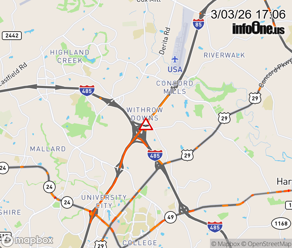 The left lane is closed near Exit 48 (I-485). Updated: Tue 3/3/26 5:06 PM EST ![]() Updated: Tue 3/3/26 5:06 PM EST |