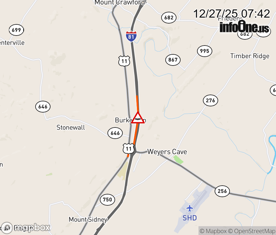 On I-81 at mile marker 236.3 in the County of Augusta, motorists can expect delays due to a tractor trailer crash. The south right shoulder is closed. Updated: Sat 12/27/25 7:42 AM EST ![]() Updated: Sat 12/27/25 7:42 AM EST |