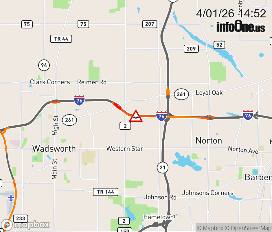 The left lane is blocked on I-76/US-224 East beyond SR-261/Akron Rd, due to a crash. ![]() |
