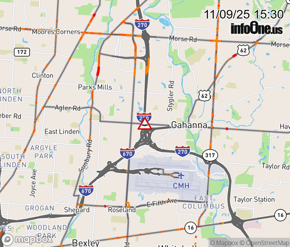 The right lane is blocked on Ramp I-670/US-62 East to I-270 North/Easton Way, due to a crash. ![]() |