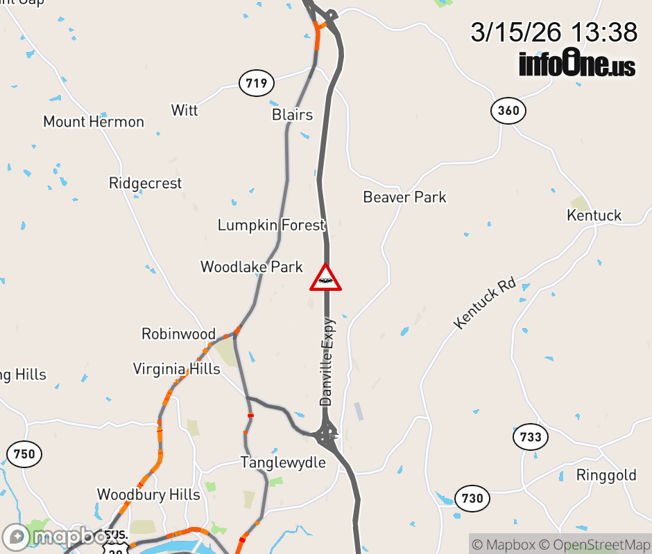 On US-29 South in the County of Pittsylvania, in the vicinity of Ramp Intersection, motorists can expect delays due to a vehicle crash. Lane closures exist. ![]() |