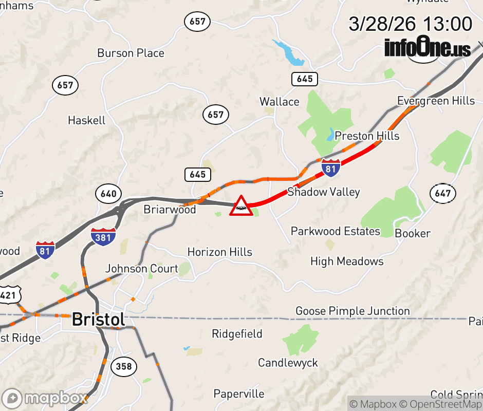 On I-81 at mile marker 6.3 in the County of Washington, motorists can expect delays due to a tractor trailer crash. The south right lane and right shoulder are closed. Updated: Sat 3/28/26 1:00 PM EDT ![]() Updated: Sat 3/28/26 1:00 PM EDT |