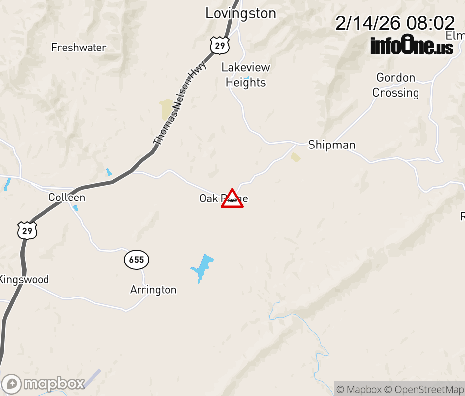 On Rt. 710 in the County of Nelson, in the vicinity of Oak Ridge Rd; Thomas F. Ryan Ln; Rt. 650N/S (Nelson County), motorists can expect delays due to a vehicle crash. All east lanes are closed. All west lanes are closed. Updated: Sat 2/14/26 8:02 AM EST ![]() Updated: Sat 2/14/26 8:02 AM EST |