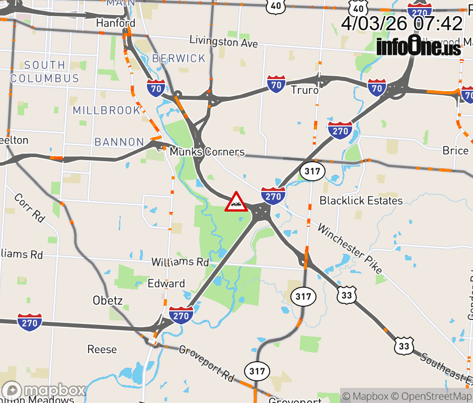 The left shoulder is blocked on US-33 West beyond I-270 South, due to a disabled vehicle. Updated: Fri 4/3/26 7:42 AM EDT ![]() Updated: Fri 4/3/26 7:42 AM EDT |