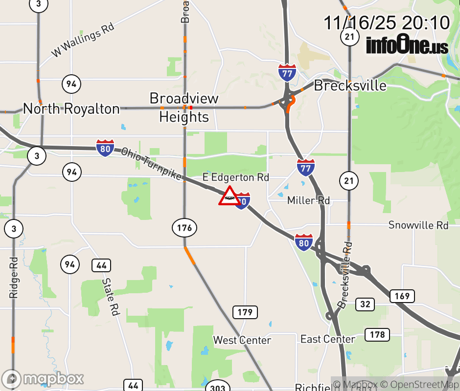 Expect lane closures on I-80 West (Ohio Turnpike) beyond I-77, due to a crash. Updated: Sun 11/16/25 8:10 PM EST ![]() Updated: Sun 11/16/25 8:10 PM EST |