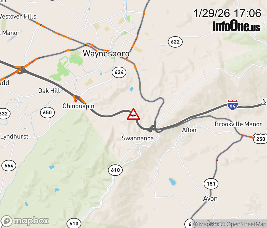 On I-64 East at mile marker 98.9 in the County of Augusta, motorists can expect delays due to a vehicle crash. Updated: Thu 1/29/26 5:06 PM EST ![]() Updated: Thu 1/29/26 5:06 PM EST |