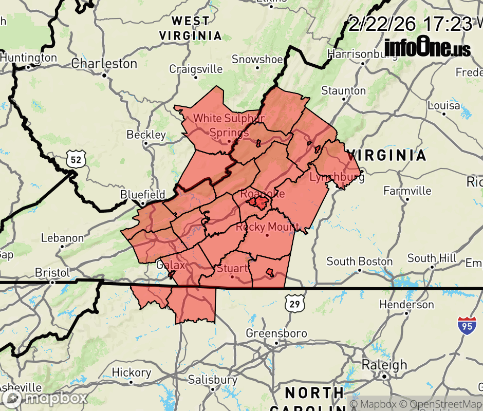 Canceled 2/23/26 3:11 AM Wind Advisory issued February 22 at 5:21PM EST until February 23 at 7:00PM EST by NWS Blacksburg VA * WHAT... Northwest winds 15 to 30 mph with gusts up to 50 mph expected. * WHERE... Portions of north central and northwest North Carolina, central, south central, southwest, and west central Virginia, and southeast West Virginia. * WHEN... Until 7 PM EST Monday. * IMPACTS... Gusty winds will blow around unsecured objects. Tree limbs could be blown down and a few power outages may result. ![]() |