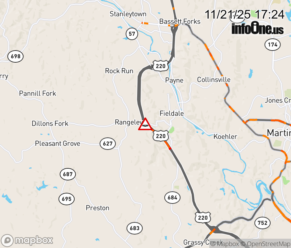 On Rt. 609 in the County of Henry, in the vicinity of the ramp to US-220, motorists can expect delays due to a vehicle crash. The north right lane and right shoulder are closed. ![]() |